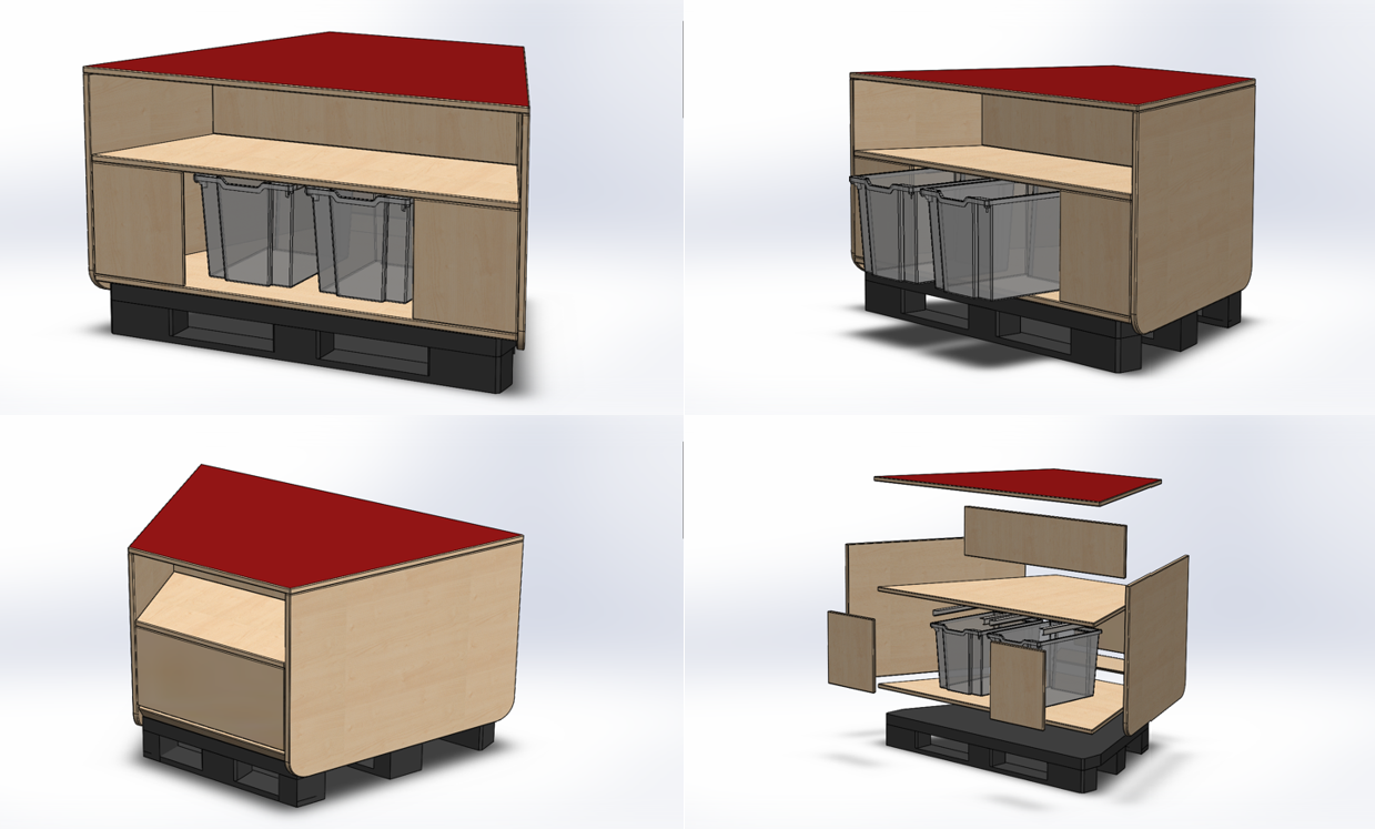 De afbeeldingen hieronder laten het eindproduct zien. Het is een meubel wat gebruikt kan worden als verbindingsstuk, tafel en opbergruimte. Door de hoek van het ontwerp kan het product op verschillende manieren geplaatst worden en zo andere meubels verbinden. Dit creƫert veel verschillende mogelijkheden.